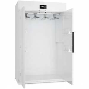 1. Platzieren Sie die feuchte Kleidung im Trockenschrank auf den Ablagen oder an den Haken.