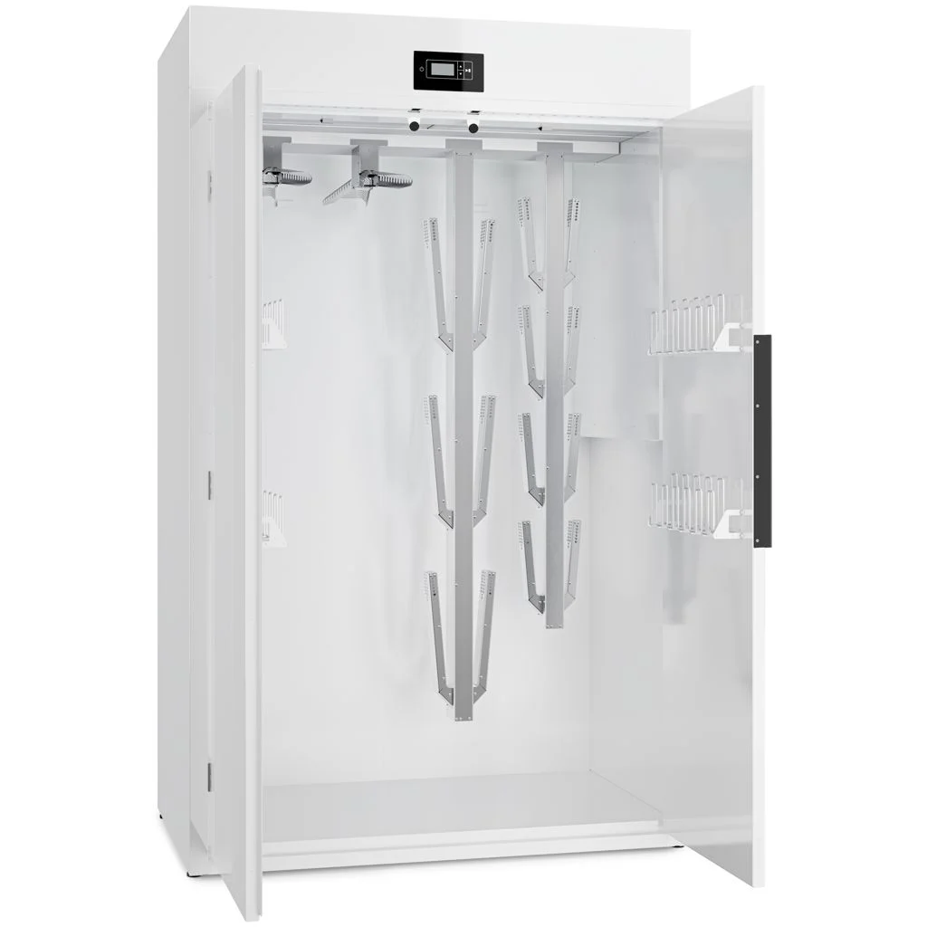 Der Trockner bietet mehrere abnehmbare Aufhängelösungen. 4 Spezialbügel für Anzüge und 4 Handschuhbügel an den Türen gehören zur Standardausstattung. Ein Deckenbügel für Schuhe und Handschuhe ist auch separat erhältlich, um diese Kleidungsstücke zu imprägnieren. Dies gewährleistet eine optimale Luftzirkulation durch die Kleidungsstücke und eine gleichmäßige Trocknung. Außerdem verhindert der Trockner das Austreten von feuchter Luft, indem er mit Unterdruck arbeitet, was einen kontrollierten und effizienten Luftabzug gewährleistet.