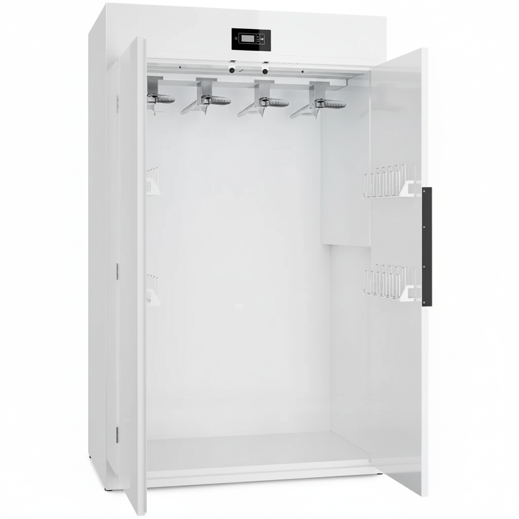 Mit einer Trocknungskapazität von 4 Packungen bietet der Schrank genügend Platz für verschiedene Arten von Textilien, einschließlich empfindlicher Stoffe und Spezialkleidung.