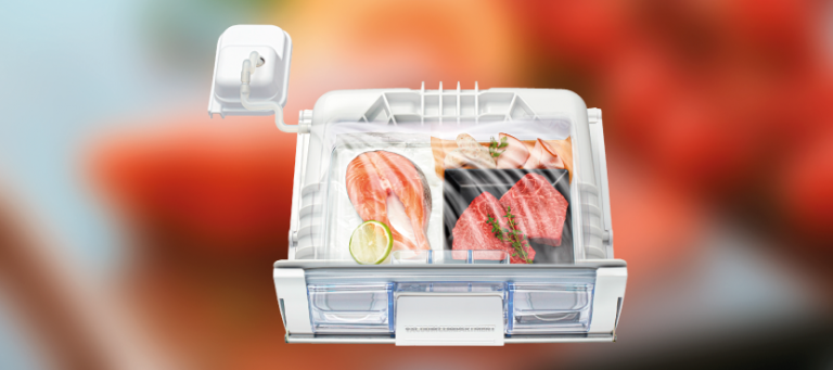 Dankzij de vacumeerlade van Hitachi blijven uw producten langer vers. De lucht in de lade wordt verlaagd tot circa 0,8 atm, waardoor vlees, vis en zuivel hun smaak en voedingswaarde behouden. Uw ingrediënten zijn direct klaar voor bereiding, zonder dat u ze eerst hoeft te ontdooien.